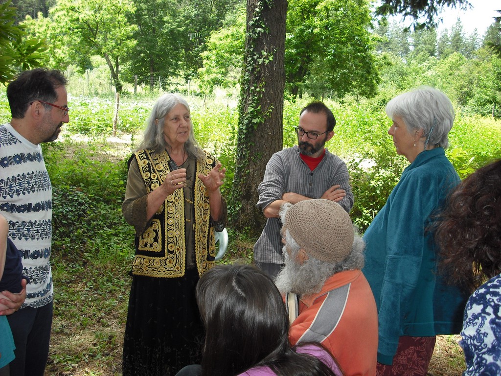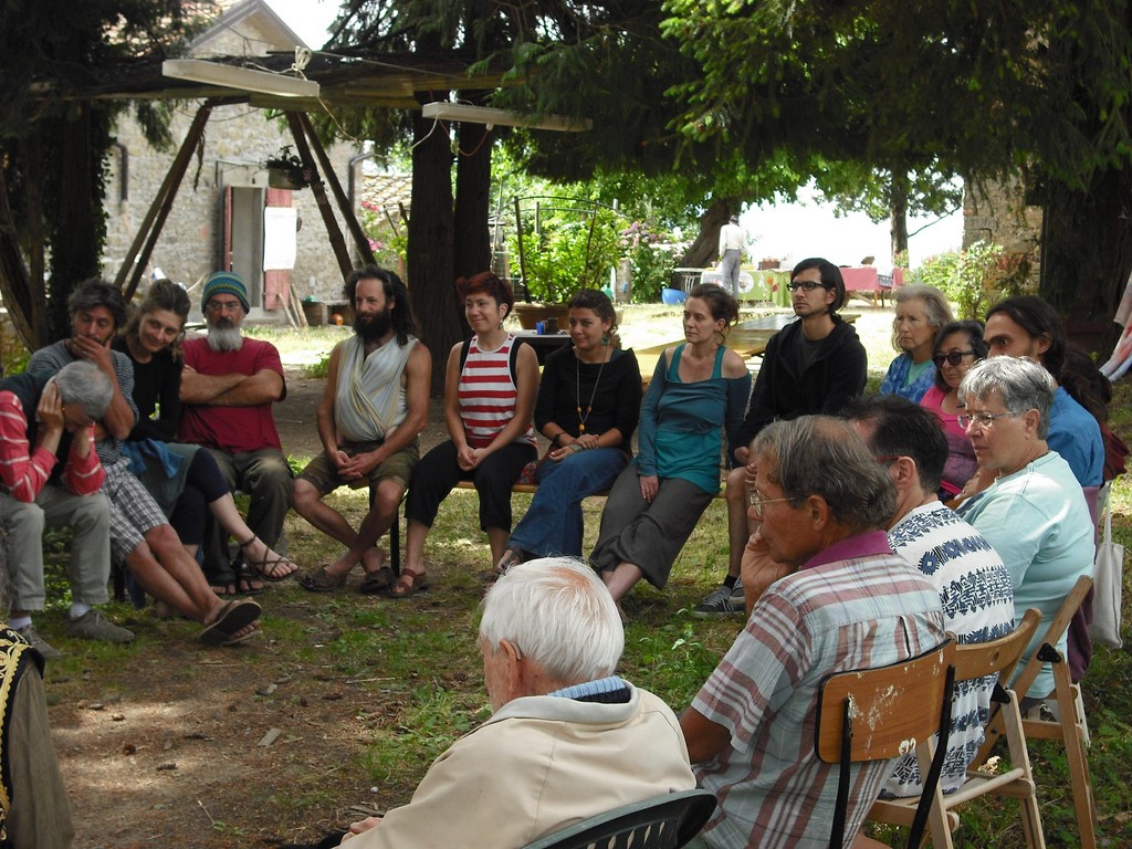 Tutt’attorno al casale c’è il bosco, bello, con alberi alti e verdissimi che però sembrano chiedersi “cosa ci facciamo qui?”. Infatti, sono il risultato della mano dell’uomo che nel secolo scorso pensava di incrementare il proprio reddito piantando conifere laddove il luogo diceva castagno e quercia. E così sono pini, cedri e abeti, addirittura abeti Douglas! che danno un ‘tocco’ di California (la loro terra d’origine), e che sembrano aver trovato una loro seconda patria, tanto crescono belli e forti. Anche i convenuti al casale hanno ritmi lenti, infatti solo a fine giornata di venerdì il grosso dei partecipanti è arrivato, trovando l’accoglienza degli ospitanti: Lorenzo e Eva, in seguito Martina e gli altri. L’eccitazione del rivedersi emoziona e mette allegria a tutti, i nuovi venuti vengono accolti con gioia, si scaricano gli alimenti per far funzionare la cucina. L’ampio fienile restaurato è la sede della cucina e del pernottamento su due piani, ma anche il posto dove aprire i banchetti per esporre libri, oggetti, prodotti della terra etc… Dopo cena, si svolge l’incontro per mettere definitivamente a punto il programma e assegnare i compiti e le mansioni per il buon funzionamento dei due giorni successivi. L’incontro vero e proprio inizia alle 10 di sabato mattina. Il tamburo di Giampietro chiama a raccolta i partecipanti, che si dispongono per il Cerchio d‘apertura. Chi è solito frequentare i nostri incontri conosce l’importanza di questo momento. Dopo le parole di ringraziamento verso chi ci ospita, il saluto ai partecipanti (anche quelli che non sono potuti venire, ma che sono con noi nella mente), allo spirito del luogo, e il salto (metaforico) nel mondo dove siamo un tutt’uno con le “10 mila cose”, la parola passa ai convenuti per presentarsi, raccontare la propria pratica, il proprio impegno, le aspirazioni, visioni, preoccupazioni, il posto (bioregione) dove si vive… (nota: Etain chiede ad ognuno il segno zodiacale, perché ha in mente di fare l’oroscopo dell’incontro). È l’una del pomeriggio quando l’ultimo dei partecipanti termina di parlare e gli addetti al pranzo sono già pronti con il cucinato e quindi il cerchio si tramuta in rettangolo, attorno ai tavoli.