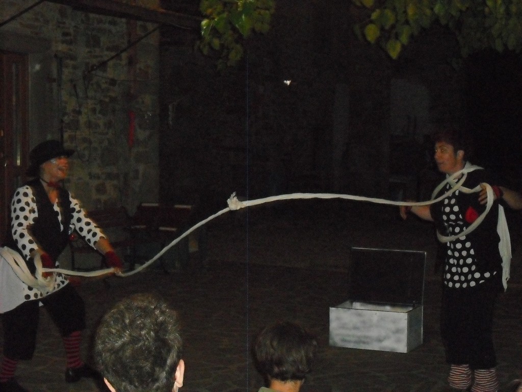 Dopo cena invece, è stata la volta di Silvana Mariniello e di Lara Panizzi, protagoniste in una performance teatrale dal titolo “Scie di memoria in pista”. Il cielo di stelle e la luna che saliva (in verità alla fine della performance), le belle musiche di Egidio e la breve presentazione di Giuseppe hanno fatto da premessa e sfondo. La trama è presto detta: due clown sono in viaggio alla ricerca del loro padrone (il clown bianco) e, nel corso del loro girovagare in giro per il mondo si imbattono in vari olocausti: gli indiani d’America (con testi presi dal librino Irochese Parole di ringraziamento, The Tracking Project 2013, da noi tradotto e distribuito) , la Palestina, gli aborigeni australiani, l’olocausto armeno, il massacro di Srebrenica. La performance è stata coinvolgente e a tratti esilarante. La sessione domenicale dell’incontro inizia con delle comunicazioni. Giuseppe, comunica l’imminente uscita (solstizio estivo) del nuovo numero del notiziario di Sentiero Bioregionale, redatto da Chiara Reggiani sul tema “I colori della natura…”, mentre la redazione del numero successivo (solstizio invernale 2017) sarà di Jo Gabel e avrà come tema “La cultura contadina… i suoi rimedi, prescrizioni, cibi, ricette, erbe…”; segue Etain, con le sue “comunicazioni ottimiste”: il bellissimo spettacolo del botanico Stefano Mancuso (l’autore di Verde Brillante) in programma nei prossimi mesi a Firenze, Bari e Pordenone; la prof. Maria Tomarchio ha parlato di bioregionalismo nel suo intervento sugli Orti di Pace a Catania il mese scorso; il 7-9 luglio si terrà a Mancetter nel Regno Unito la 12° conferenza della Fondazione Prometheus su Deep Philosophy, Deep Ecology; infine, il libro di Freya Mathews Per amore della materia uscirà a settembre per Magi editore. Laura T. ha relazionato sulla questione dei vaccini e la mobilitazione che ne è seguita dopo il decreto governativo all’obbligo di somministrazione degli stessi; Rosaria, ha fatto conoscere il lavoro dell’associazione Tatawelo di Torino, rivolto al sostegno economico dei produttori del caffè nel Chiapas, promuovendo acquisti anticipati in modo da assicurare un reddito sicuro per i contadini di questa bioregione. Per maggiori dettagli: tatawelo.it .