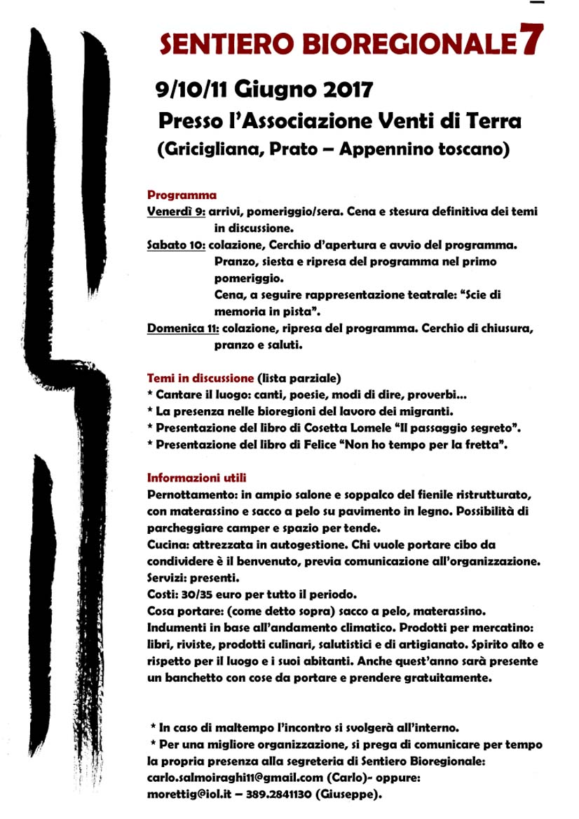 il 9, 10, 11 giugno 2017Presso Venti di Terra Presso l’Associazione Venti di Terra (Gricigliana, Prato – Appennino Toscano) di seguito RESOCONTO E IMMAGINI dell’incontro |