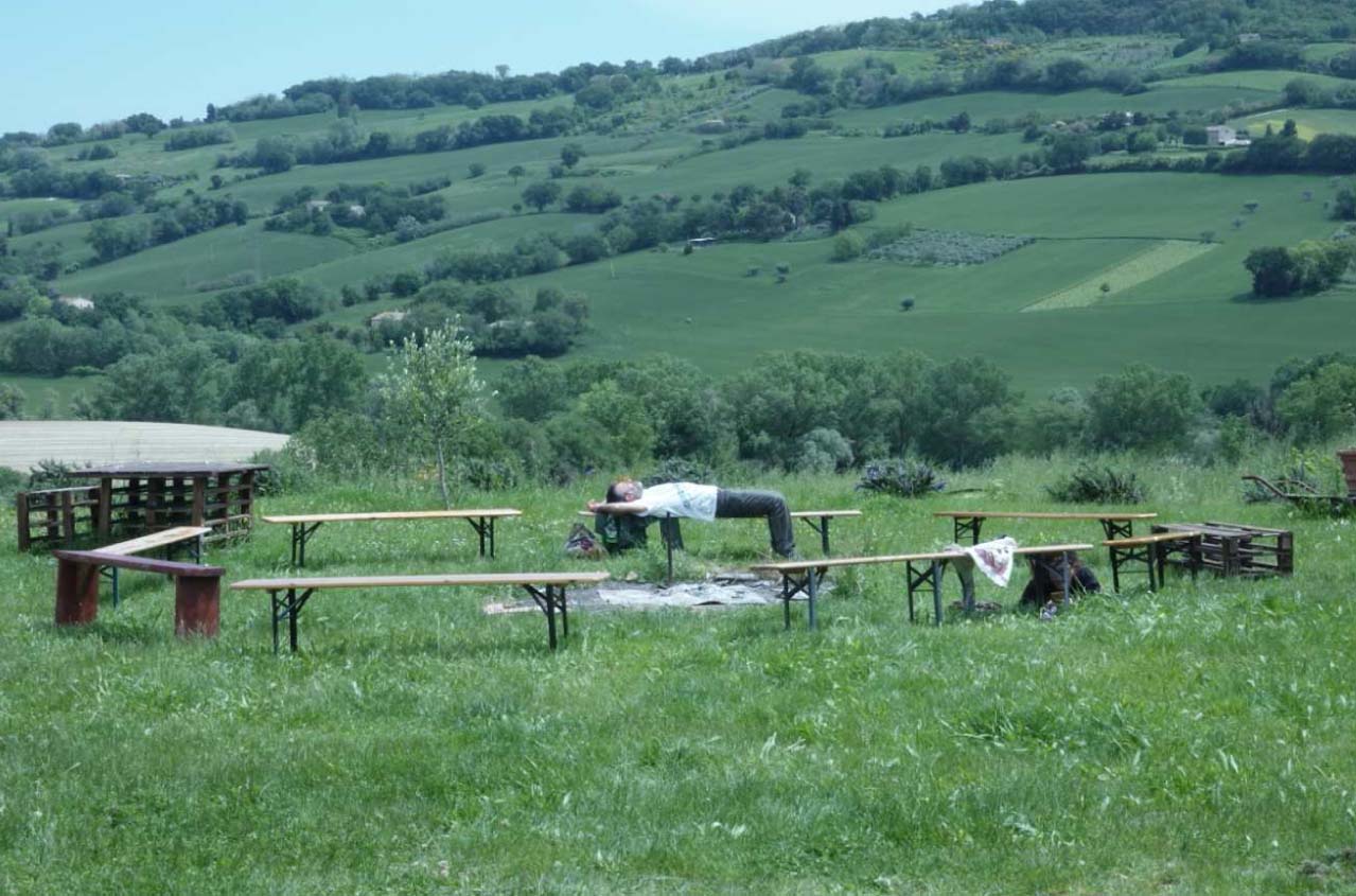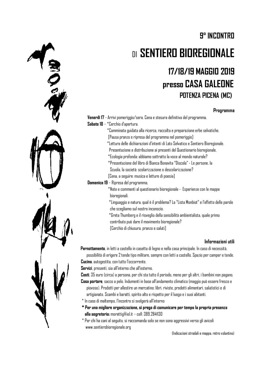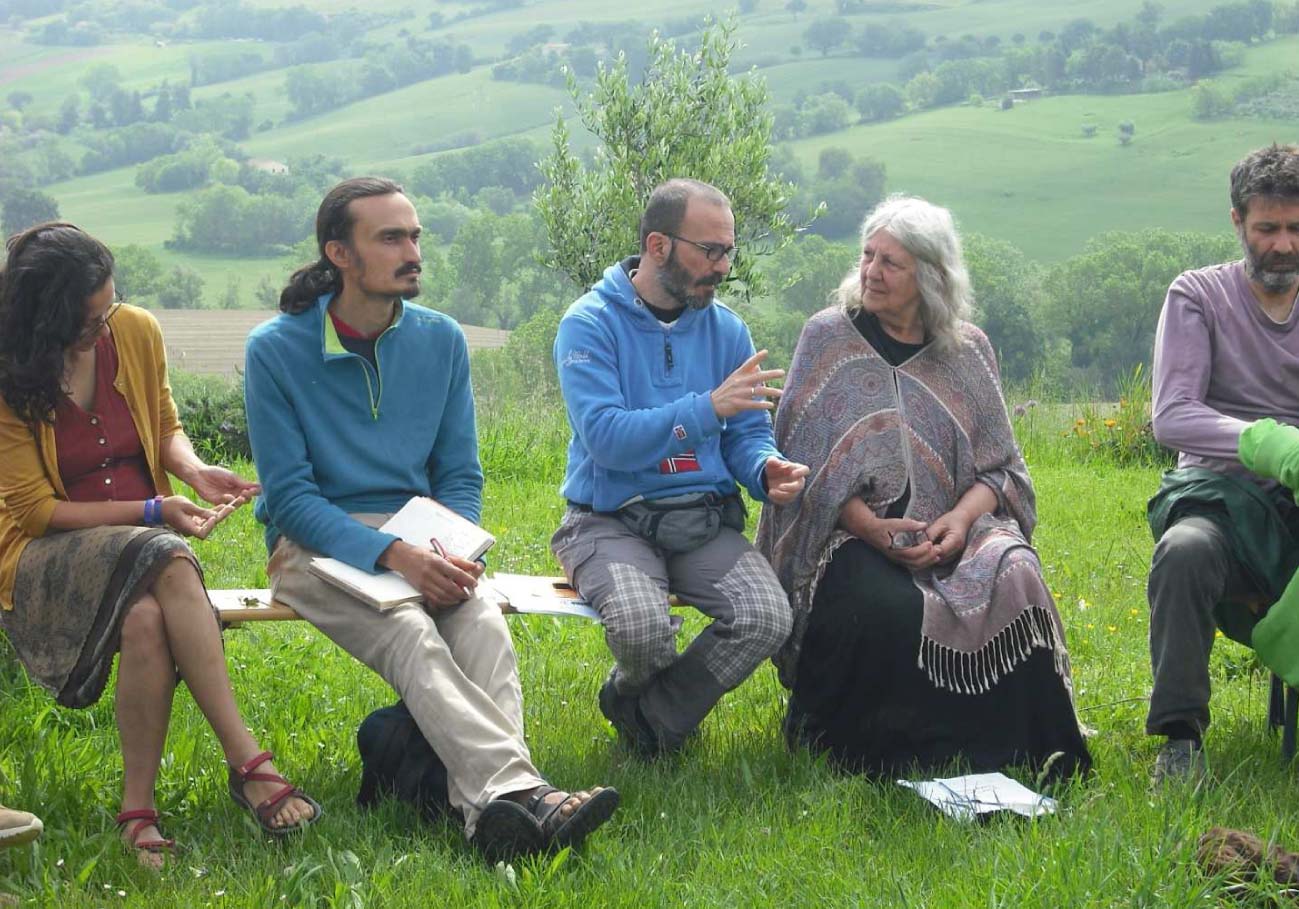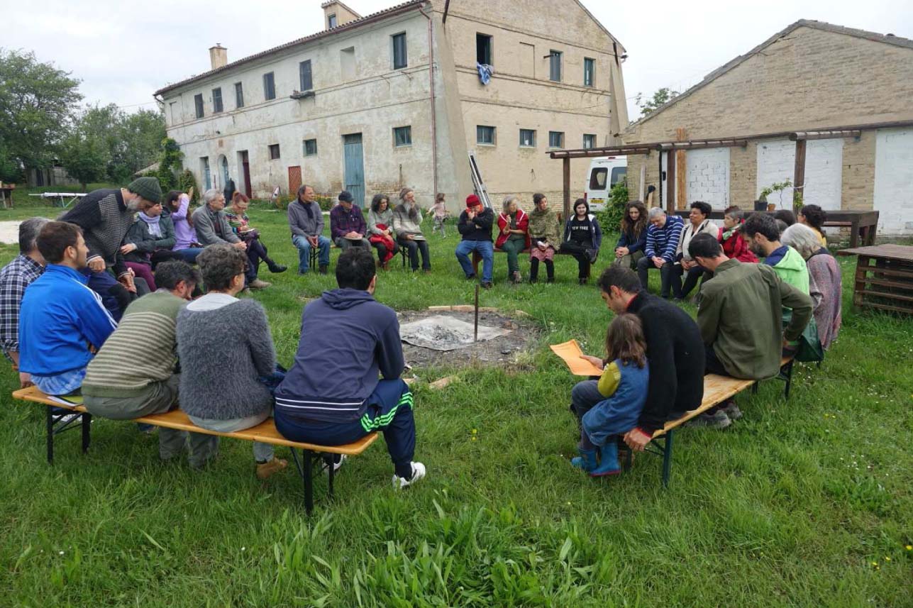 Nel lato selvatico della mente, scavando verso le radici. L’acqua scorre in torrenti verso il fiume, e poi in mare. Acqua che tutto connette: luoghi, piante, animali umani e non, inquinamento, incontro, mutamento. Bacino del torrente Asola, Potenza Picena, un piccolo bacino ma principale, che immette subito nel mare adriatico. Alle pendici del bacino, la Casa Galeone, proprio lì in mezzo al prato, le panche disposte a cerchio, il cerchio del Sentiero che prende i (e s’allarga nei) primi respiri. Simon ha costruito con Tsuf una hydraulic ram, pompa a colpo d’ariete: un laghetto, un dislivello, un tubo di alimentazione, e senza elettricità la colonna d’acqua in caduta genera un’onda d’urto, con l’aumento di pressione che la pompa sfrutta rimandando acqua verso l’alto. Ritmo battente. Acqua che esonda, sommerge, avvolgeva la casa di Giuseppe durante l’alluvione, e lui – racconta – tornava di sera con una canoa, viveva il suo spazio come un uomo antico, alla luce della candela, in mezzo alle acque, nel fiume. Acqua di pioggia che cade sul cerchio, vento freddo e aria tiepida. Foschia, all’orizzonte una conchiglia azzurra di mare ci rimanda lo sguardo. Maggio fresco e bagnato.
