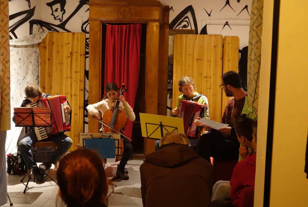 La sera è tiepida, il vento si è fermato. Sale la foschia e la luna si affaccia tra le nuvole proprio nel momento in cui Felice legge la sua poesia, sulla luna e su un uomo che la guarda raccolto in un antico silenzio “d’innata intelligenza universale”. Sabato di musica, il sipario costruito ad arte da Tsuf, Nevet e Mattia. Le fisarmoniche, il violoncello di Adele. I canti, poi la notte, piccole sagome intorno a un falò che va spegnendosi.