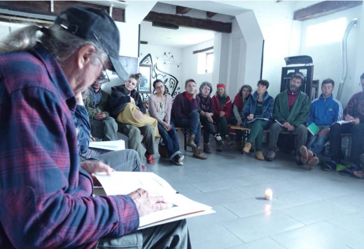Teoria e azione si separano, in mezzo c’è spazio per gli scettici, per chi depista, devia, ammorbidisce. Francesca sottolinea l’importanza della precisione nella divulgazione, delle parole giuste, di effetto serra e non cambiamento climatico. Uno slancio positivo, il tam tam Greta, forse uno smuoversi oltre anni di amorfismo. Ma legato a una consapevolezza giorno per giorno? Si chiede Elena. Legato a un’azione sul territorio che abitiamo? Il poeta Gary Lawless scrive una lettera a Gary Snyder. Lo ringrazia per quando è stato ospitato, per ciò che Snyder gli ha tramandato. Azioni, azioni semplici, azioni senza imposizioni. Felice torna su questo: noi in azione, ogni passo energia, ispirazione e altra energia, aldilà delle parole, degli slogan, della diffusione di messaggi sui social media, a rischio di quell’effetto anestesia a cui accenna Laura: parole tra le tante, immagini da scorrere, appiattirsi di significati. Allora il contributo autentico del Sentiero può diffondersi attraverso i media, piazze virtuali, o rimane fecondo in azioni, gesti, semplice (quanto difficile!) tramandare? Il giovane può e potrà cercare il materiale di cui ha bisogno nelle esperienze che lo hanno preceduto, nel lavoro e nel canto che negli anni si è sparso tra montagne, praterie e città. Sempre una storia d’amore, chiosa Eustochia.