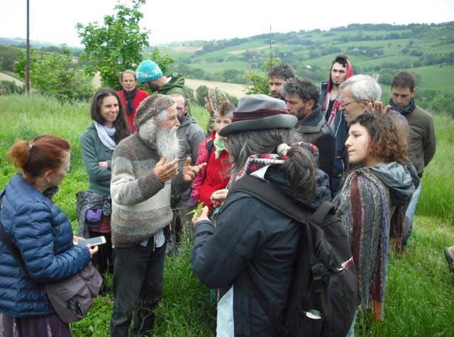 Passeggiare intorno al podere, là dove crescono piccole oasi di diversità in mezzo a omogenei tappeti di verdegrano. Felice tocca e indica erbe selvatiche. Farinello, Amaranto, Aspraggine e Calendula incontrano i nostri occhi e le nostre dita (nomi in realtà vagabondi, da dialetto a dialetto, erbe che raccontano). Impariamo a sbucciare gambi di Sulla, dolci al palato. Raccogliere Bietola, anche, per la cucina. Per ritrovarle nei pasti.