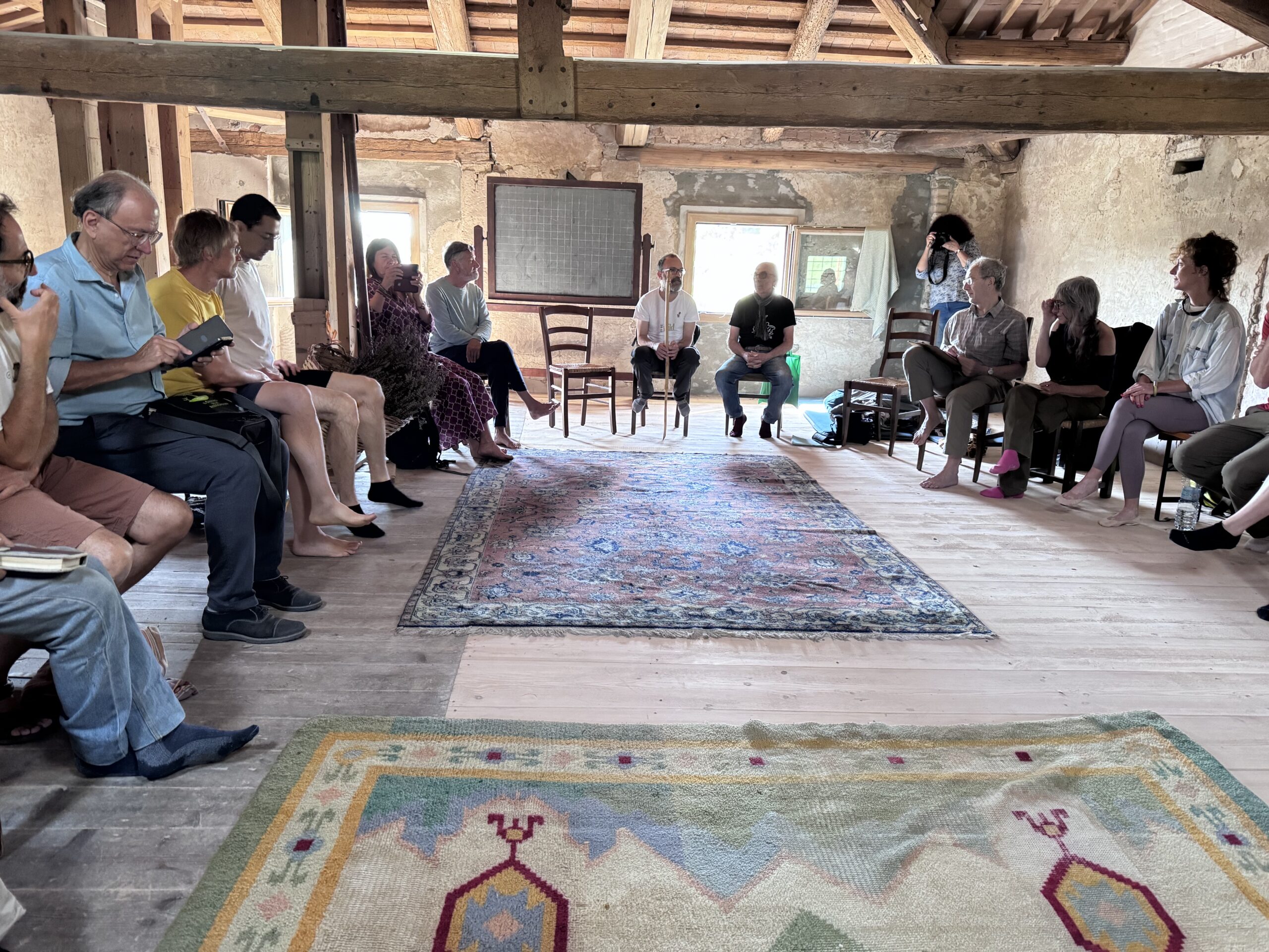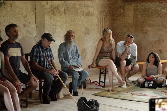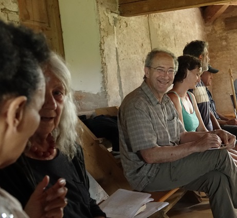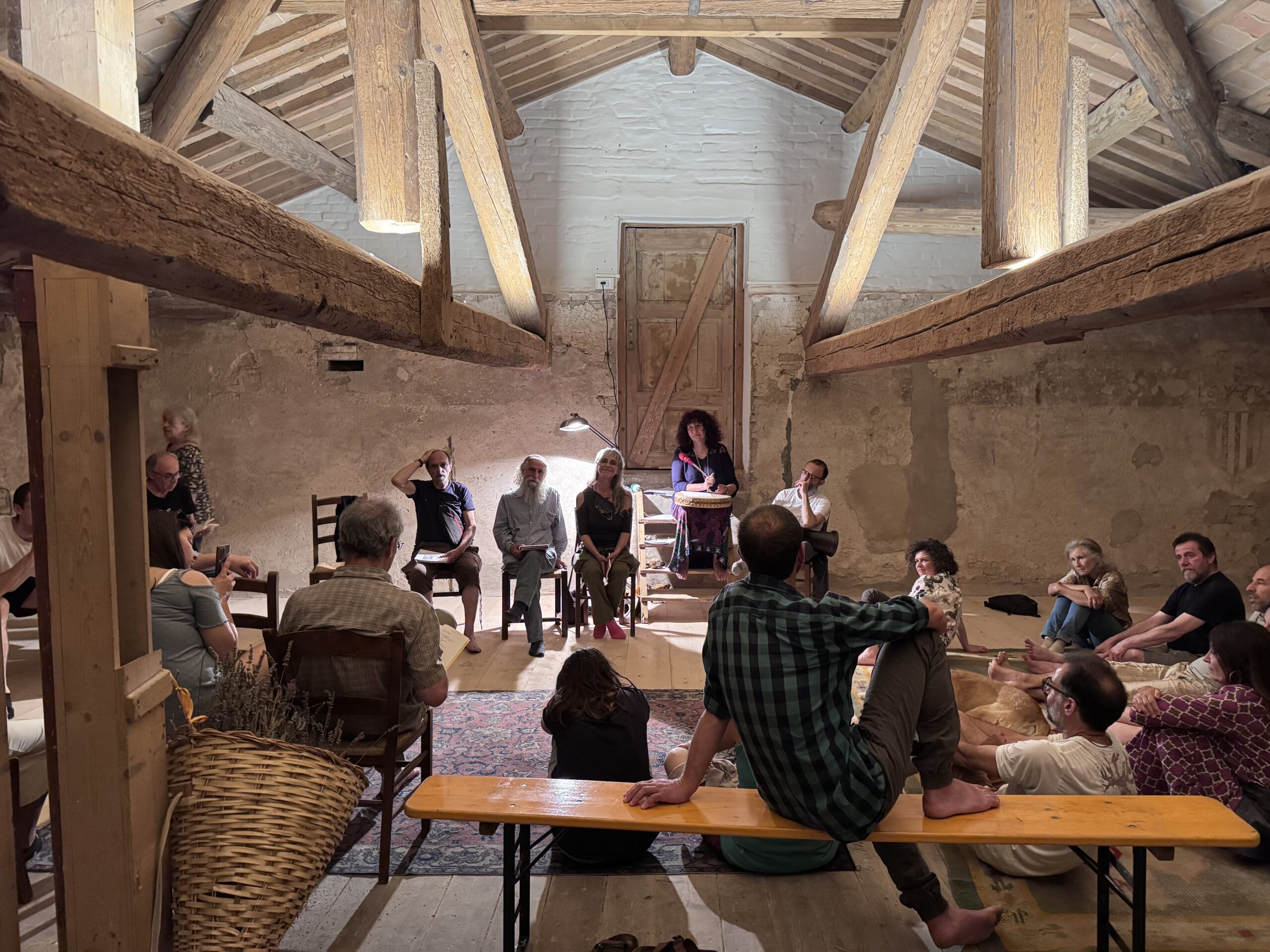 Giuseppe Moretti, fondatore della rivista “Lato Selvatico” e precursore del bioregionalismo italiano, apre l’incontro esordendo con “sono un contadino” e dando lettura del testo “Restiamo umani”. Giuseppe esprime la sua preoccupazione per i cambiamenti epocali in atto, come l’avvento dell’intelligenza artificiale, che già adesso fa sentire i suoi effetti in una nuova corsa allo sfruttamento delle risorse, le cosiddette terre rare, e in una ulteriore velocizzazione dei tempi e ritmi che mai l’umanità ha conosciuto prima. Cita un testo di Oren Lyons (delle Sei tribù Irochesi) sull’importanza del seguire le leggi della natura, cita la rivoluzione delle coscienze e si chiede: “siamo davvero al vertice dell’evoluzione sulla terra?”. Con questo interrogativo ribadisce quanto il Bioregionalismo sia più che mai una prospettiva potente che va divulgata e praticata.